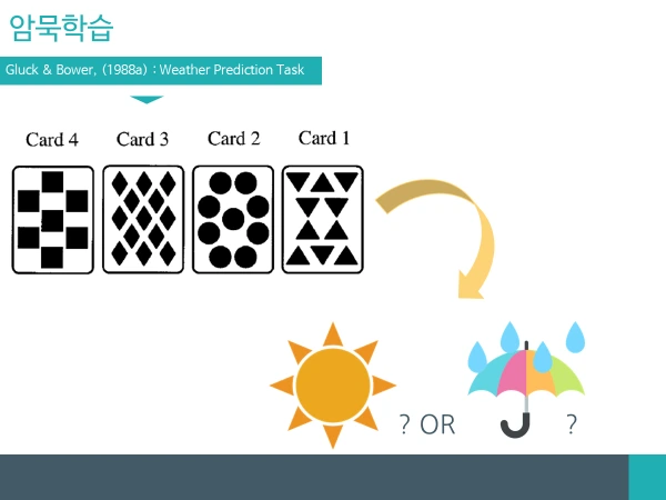 암묵학습과 관련해서 소개해드릴 두 번째 실험은, ‘날씨예측과제(Weather Prediction Task)’입니다 (Gluck&Bower,1988). 간단히 말해, ‘피드백을 통한 암묵적 학습’이 이루어지는지를 확인해 본 실험인데요, 실험방법은 다음과 같습니다.