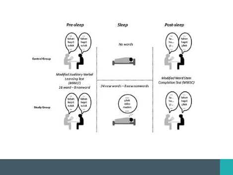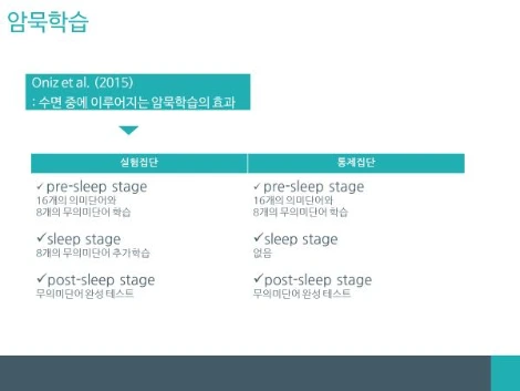 암묵학습과 관련해서 첫 번째로, ‘수면 중에 이루어지는 암묵학습의 효과’ (Oniz et al.,2015)에 대한 실험연구를 소개하겠습니다. 이 실험에서는 먼저 피험자들을 실험집단과 통제집단으로 나누고, 수면 전 단계(Pre-sleep stage), 수면단계(Sleep stage), 수면 후 단계(Post-sleep stage)의 세 가지 절차로 구분하여 단어 학습이 얼마나 성공적으로 이루어지는지를 측정했습니다.