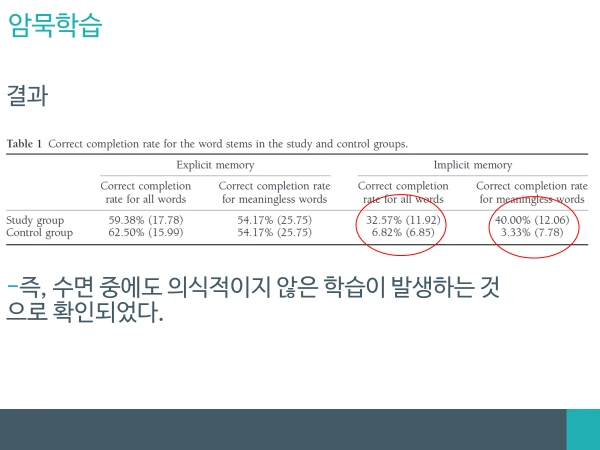 실험 결과는 놀라웠습니다. 두 집단 모두 외현기억(Explicit Memory)에서의 단어완성률은 비슷했으나, 암묵기억(Implicit memory)에서는 유의미한 차이를 보였기 때문입니다. 모든 단어들에 대해서, 수면 중 무의식적 학습이 이루어진 실험집단이 훨씬 높은 성공률을 보였습니다.