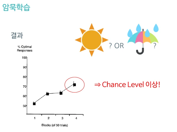 이처럼 4차례 시행을 거쳐 피드백을 한 결과, 날씨를 맞춘 성공률이 점점 올라가는 것을 확인할 수 있었습니다. 첫 시행처럼 맞았거나 틀린 Chance Level에서의 50% 정답률이 지속되는 것이 아니라, 피드백에 의해 80%의 정답률에까지 육박하게 되는 것입니다. 여기에서 중요한 점은, 피험자들이 80%의 높은 정답률로 답을 맞추고 난 후에도, 이 과제가 무슨 규칙을 가졌는지 모른다는 것입니다. 그저 무의식적으로 그것이 정답인 것 같아서 고른 것이죠. 이는 실험자가 준 피드백들을 기반으로 피험자가 스스로 암묵적인 학습을 이뤄낸 결과라고 볼 수 있습니다.