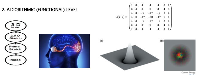 두 번째는 알고리즘 수준, 또는 기능적 수준이라고 불립니다. 관찰된 행동이 출현하기 위해, 시스템 내에서 정보가 어떻게 입력되고 처리되는지를 기술하는 단계입니다. 인간 시각의 알고리즘, 혹은 시각 정보처리 과정에 대해 연구하는 수준이라고 볼 수 있습니다.