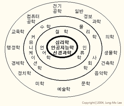 인지과학의 중심 학문과 주변 학문들을 나타낸 이 도식을 보면, 인지과학에 관여하고 있지 않은 학문이 거의 없을 정도로 많은 분야가 인지과학과 연관되어 있다는 것을 알 수 있습니다.