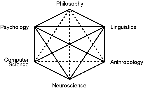 아마 첫 번째 글에서 보았던 이 도식을 기억하실 텐데요, 슬로언 육각형이라고 불리는 이 도식은 슬로언(Sloan) 재단에서 지원받은 인지과학자들이 작성한 보고서에서 처음 등장했습니다. 이 육각형은 인지과학에 관여하고 있는 학문들의 연계성을 보여주는데요, 굵은 실선으로 연결된 것은 연계가 강한 것, 점선으로 연결된 것은 연계가 약한 것을 의미합니다. 물론 이것은 학문들의 관계를 매우 단순하게 해석한 설명입니다. 그렇지만 슬로언 육각형은 인지과학이 학문 간 연계를 통해 이루어지는 분야임을 보여주는 대표적인 도식이라고 할 수 있습니다.
