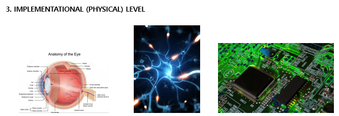 마지막으로 세 번째는 구현적 수준, 또는 물리적 수준입니다. 이 수준에서는 앞선 수준에서의 행동과 정보처리를 가능하게 하는 하위 하드웨어 수준의 특성에 대해 다룹니다. 인간 눈의 하드웨어 혹은 정보처리를 가능하게 하는 뉴런 자체의 특성, 컴퓨터의 회로와 같은 하드웨어 연구가 이 수준에 속한다고 할 수 있습니다.