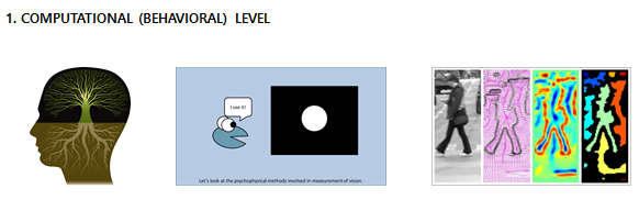 그 설명에 따르면 첫 번째는 계산적 수준, 또는 행동적 수준으로 인간, 동물, 컴퓨터의 외적으로 관찰 가능한 행동을 기술하는 수준입니다. 인간 행동에 대한 철학적 고찰이나 행동 관찰, 컴퓨터 시각의 소프트웨어가 이 수준에 해당된다고 할 수 있습니다.
