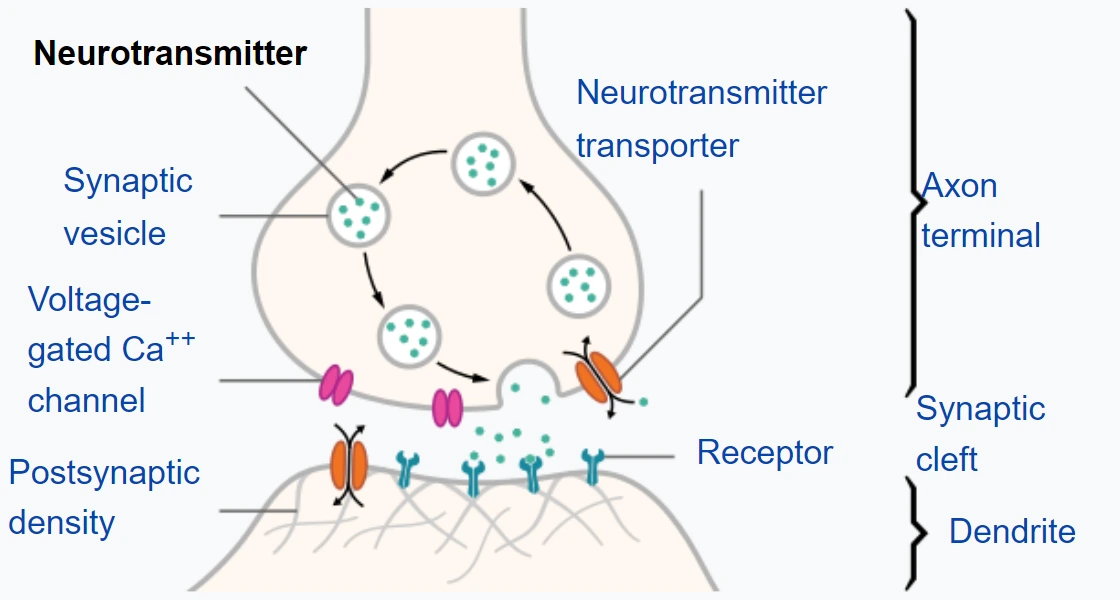 이러한 신경전달물질이 어떻게 분비되고, 어떻게 받아들여지며, 어떤 작용을 하는지 그림을 통해 조금 더 자세히 알아보도록 하겠습니다. 신경전달물질은 시냅스를 가로질러 다른 세포에 영향을 주기 위해 뉴런에서 분비됩니다. [그림1]을 보시면, pre-synapse의 axon terminal 구간과 post-synapse의 dendrite 부분이 서로 조금의 공간을 두고 맞대고 있는 것을 알 수 있습니다. 이 공간을 synaptic cleft라고 하는데, 이 곳이 바로 신경전달이 일어나는 공간입니다.
