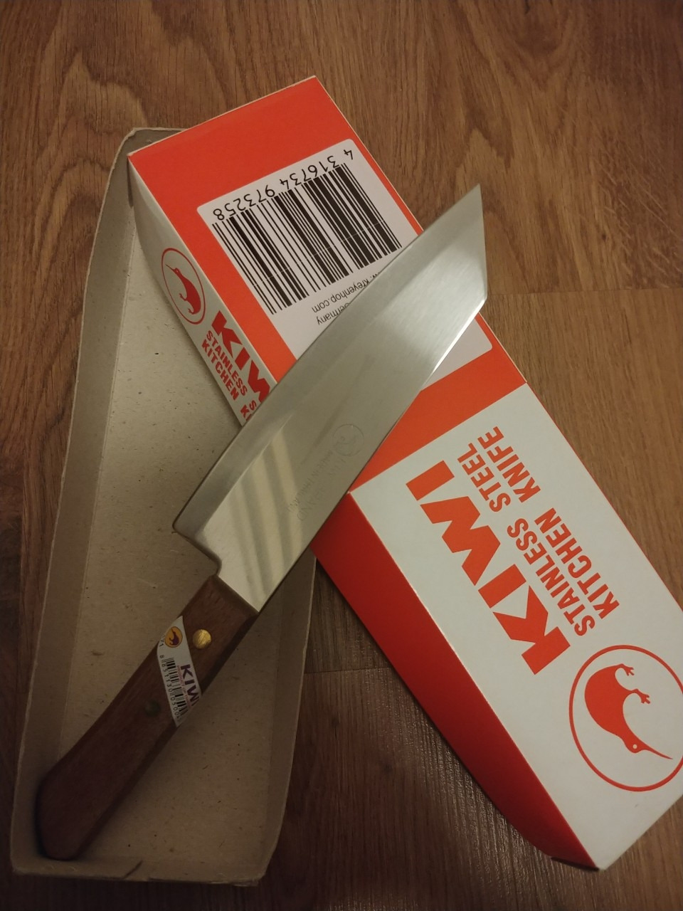 정육점에서 보았던 네모난 모양의 큰 칼, 회를 뜰 때 사용하는 예리하게 날이 선 긴 칼, 마늘을 통째로 쳐서 다지는 네모진 칼들이 쌓여있다. 한국에서 가장 많이 쓰는 주방용 칼도 딱 한 자루 놓여있었다. 더구나 그 칼은 다른 칼들보다 저렴한 3.99유로 가격이다. 칼자루를 잡고 써는 흉내를 내 보았다. 가볍고 날도 예리하다. 기쁜 마음에 더 이상 묻지도 따지지도 않고 가격을 지불하자마자 날듯이 집으로 왔다.