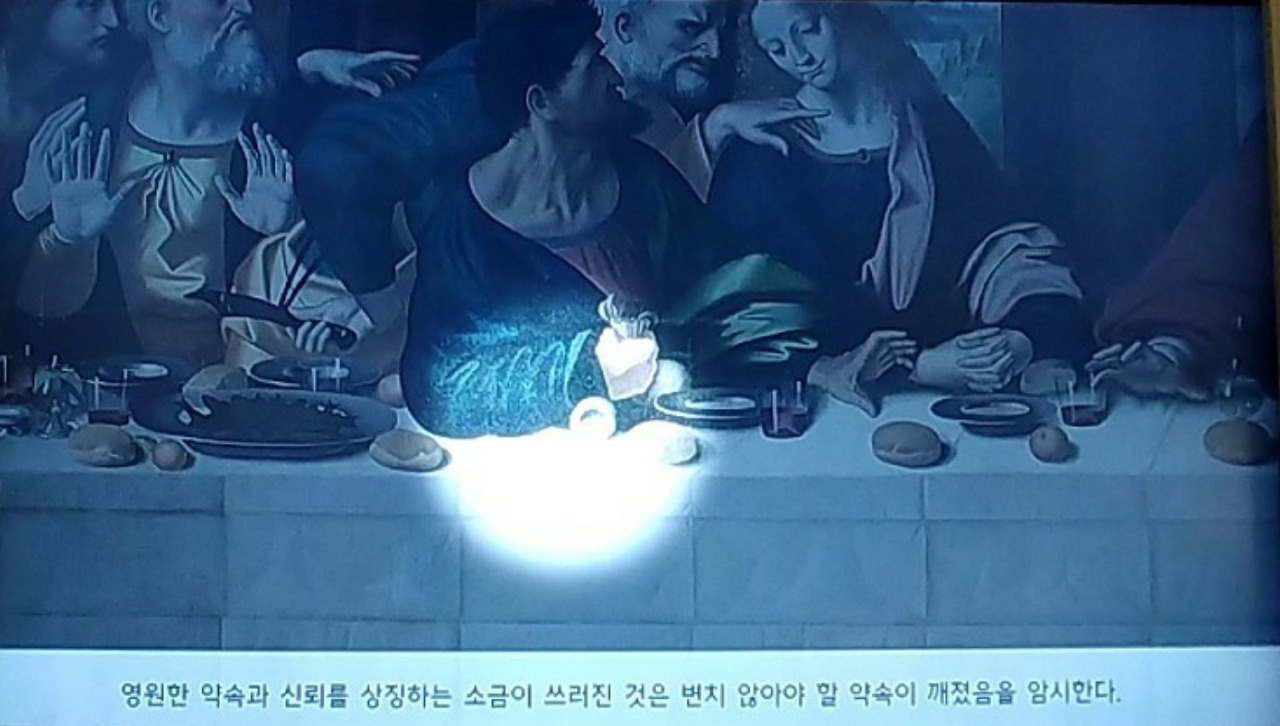 국립 민속박물관에서는 세계 소금 특별전을 하고 있었다. 경복궁의 넓은 뜰을 돌아 배도 고프고 다리도 아파서 그냥 지나치려다가 특별전이니 한번 보고 가자며 안으로 들어갔다. 규모가 크지는 않았지만 소금의 역사, 만들어지는 과정과 특징, 소금 관련 그림과 채취할 때 쓰는 물건들이 전시되어 있었다. 각 나라 소금을 시식해 보는 곳도 있었지만 내 눈길을 사로잡은 곳은 영상관이었다. 4년에 걸쳐 완성된 레오나르도 다빈치의 그림 최후의 만찬에 알려지지 않은 숨은 이야기가 있다는 것이다. 그림에는 예수를 중심으로 열두 제자가 긴 식탁에 둘러앉아 식사를 하고 있다.
