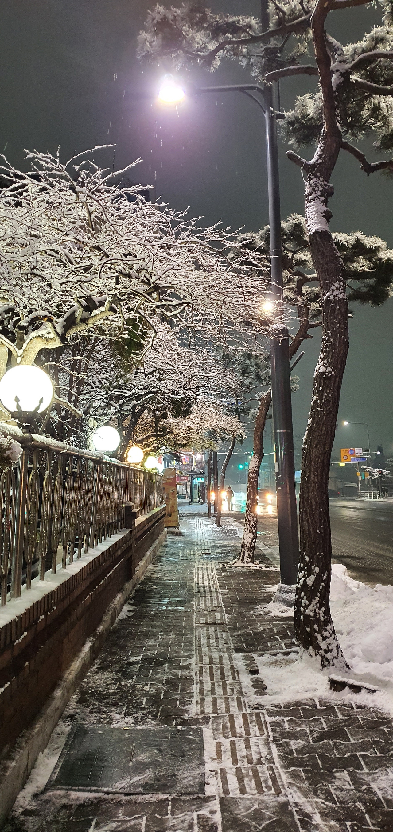 축복처럼 하얗게 쏟아지는 눈발을 바라보며 식당 한켠에 자리를 잡았다. 매콤한 주꾸미 볶음에 밥 한 공기 쓱쓱 비벼 거뜬히 해치웠다. 뜨끈한 바지락 칼국수는 매운 속을 시원히 달래주며 아직도 낯선 곳에서 긴장의 끈을 풀어놓는다.