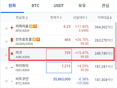 아크코인은 오늘 업비트 원화마켓 기준 거래량 3위로 치고 올라왔다.