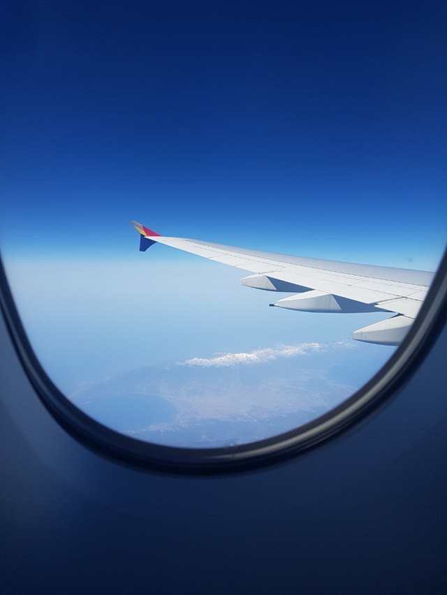 약 12시간을 깨어있었다는 고통 빼고는 비행에 불편한 점은 없었다. 백만년만에 타는 비행기였는데, 요새는 비행기 티켓을 끊어놓고 좌석을 선택할 수 있어서 2층 창가쪽 자리를 택했다. AA나 델타같은 숨막히는 좌석도 아니었고(그래도 엉덩이가 조금 많이 배겼다) 슬리퍼, 담요, 베개 등 제공품들도 요긴했다.