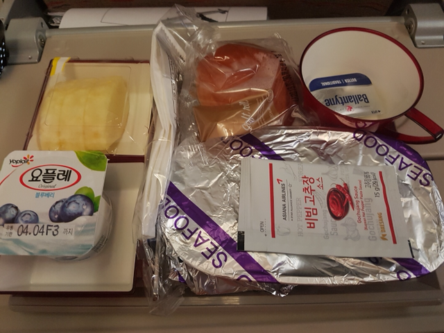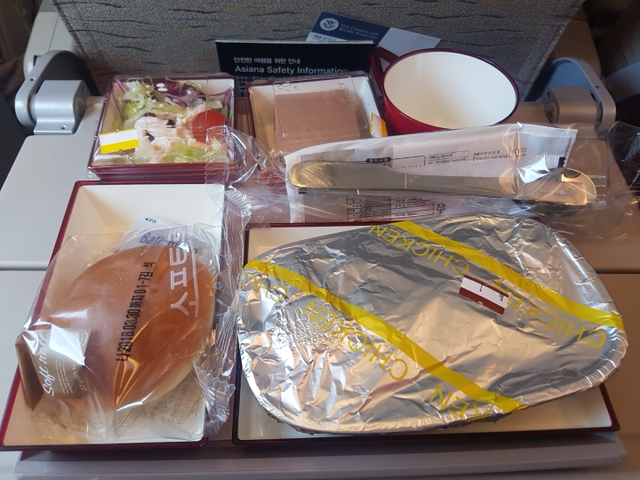 비행동안 2번의 기내식, 1번의 간식이 나왔다. 한식과 양식을 고를 수 있게 하는데, 한식은 쌈밥과 해물덮밥이었고 양식은 치킨스테이크와 치킨파스타였나 그랬다. 이왕이면 한식을 두번 먹을 걸 그랬다. 쌈밥이 땡기지 않아서 치킨스테이크를 주문했는데, 소스가 크림이라 한 서너 번 먹고는 후회했다. 미국으로 가면서 이런건 줄기차게 먹을텐데, 생각이 짧았다. 해물덮밥은 맛이 없었다.