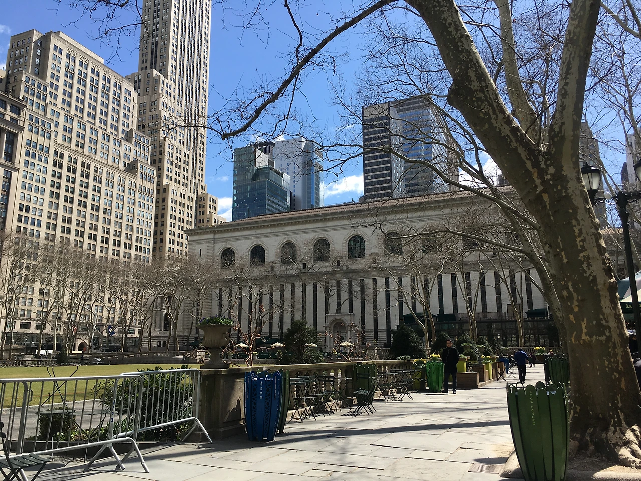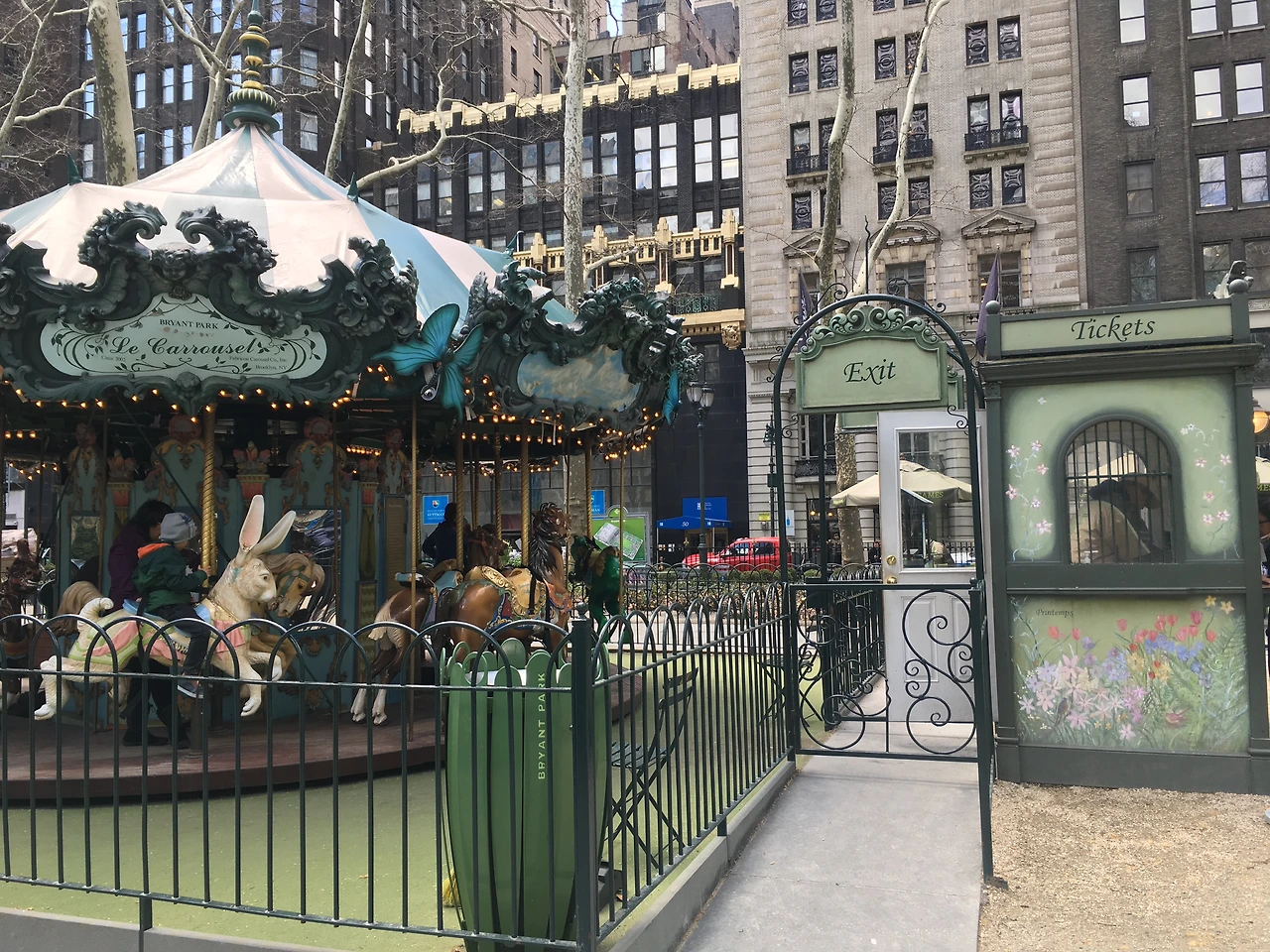 블루보틀 브라이언트 파크 쪽 지점은 오래 앉아있을 장소는 아니다. 테이크아웃시켜서 바로 앞에 공원으로 슬렁슬렁 걸어갔다. 사실 나는 여행하는 사람처럼 어떤 계획을 가지고 뉴욕을 보는 게 아니어서, 일단 어디든 간 다음에 지도를 찍어서 여기가 어딘가 하는 하루를 보내고 있는데, 라테를 들고 나와 공원에 앉아보니 여기가 브라이언트 파크였다. 공원에 회전목마도 있고 테이블도 엄청 많아서 아침에 산 베이글 하고 라테를 테이블에 앉아 자유롭게 먹었다.