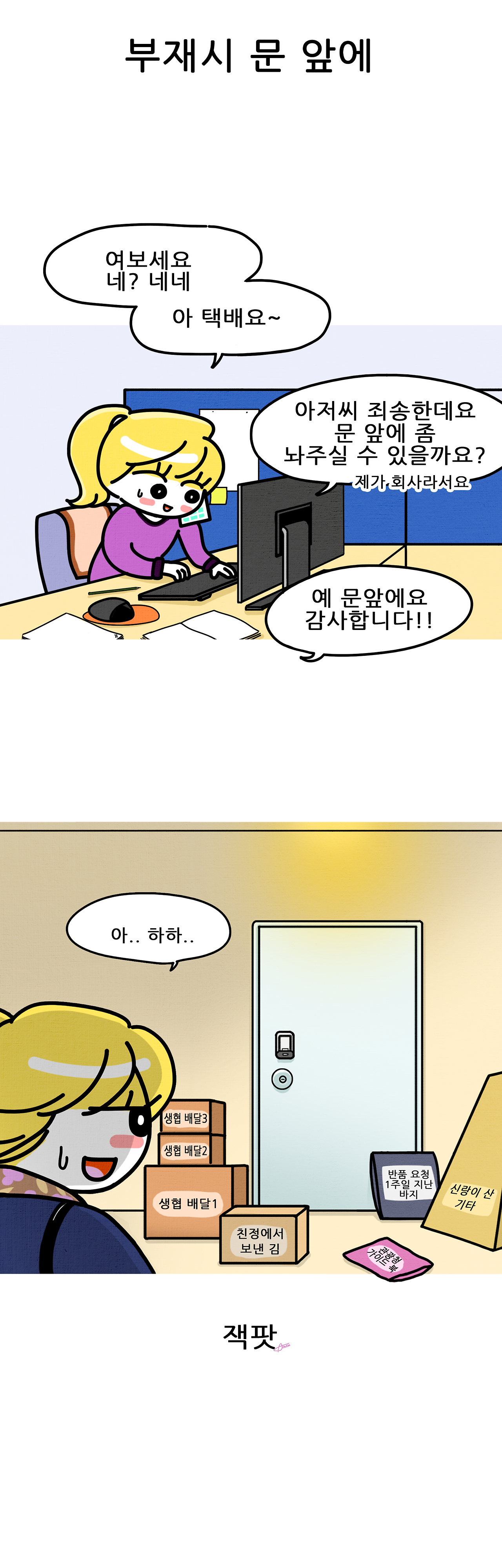 급여일 후 일주일 동안 문 앞은 그야말로 택배상자로 성을 쌓을 지경입니다.