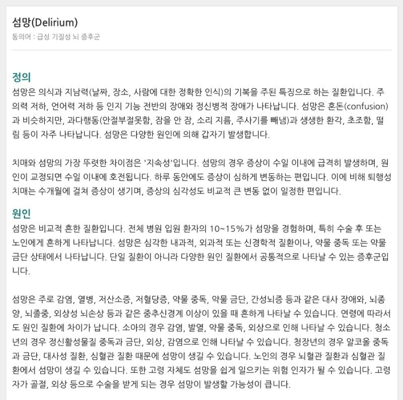 "아버님이 상태가 많이 안 좋으셨어요. 금단 증상, 섬망에 자주 빠지면서 자꾸 정신을 놓으세요. 여기가 어딘지 모르고, 몇 년도고. 00동이라고 하고. 딸이 왔다고 하고. 증상이 가늠이 안 돼서 최소한의 약물로 안정을 취하고 있지만 약 조절을 해보면서 지켜보는 중이라 전화 사용이 불가한 상태입니다"