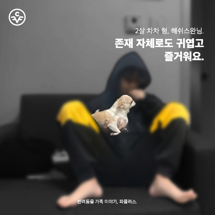 입양한 지 2년 됐어요. 강아지를 원래 키우고 싶긴 했는데 인스타그램을 보다가 유기견에 관련된 내용을 발견했어요. 그래서 데려와야겠다 싶어서 갔다가 얘를 데려 오려던 건 아닌데 생긴 거 보고 바로 데려오게 됐습니다.