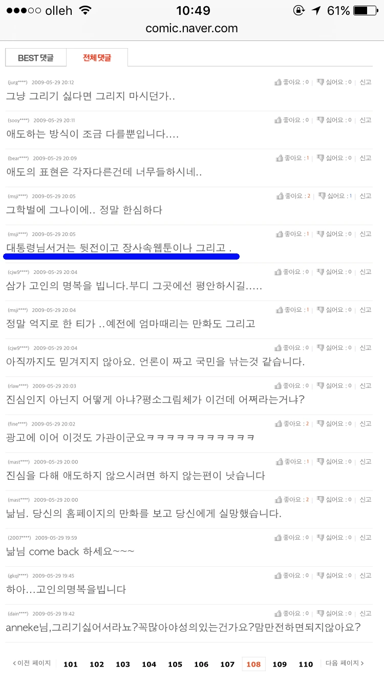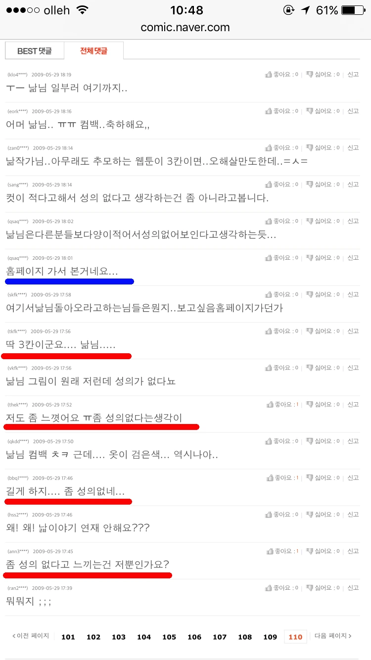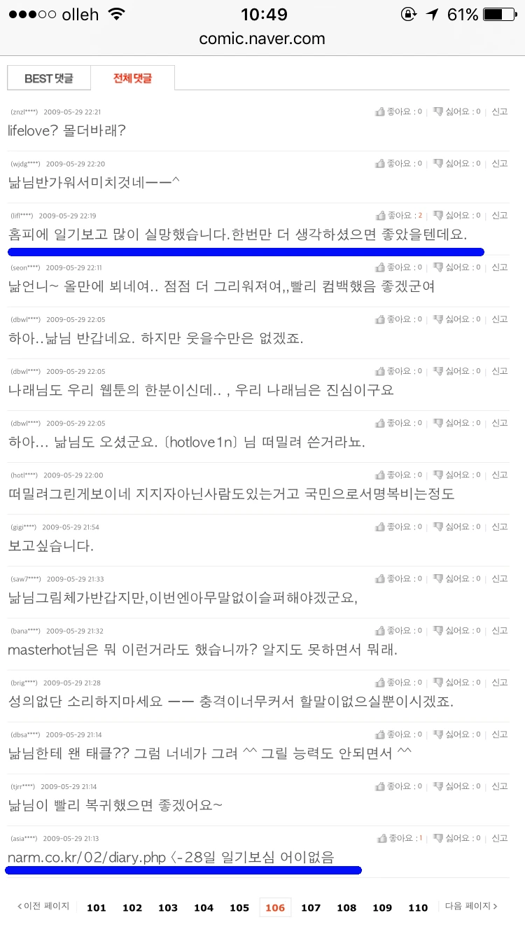 홈페이지 만화를 보고 당신에게 실망했습니다라는 표현에서부터 장사 속 웹툰이나 그린다는 식의 내용들이 등장한다.