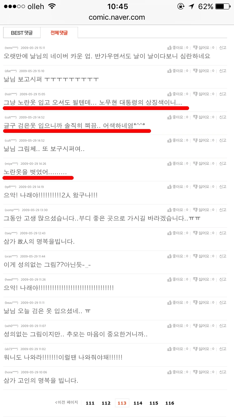 이후 시간이 지나서 14시 26분에 처음 '노란 옷을 벗었다'는 뉘앙스의 댓글이 올라온다.
