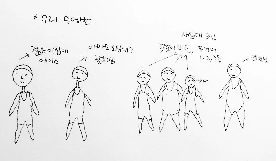 마흔일곱 되던 해의 가을, 여성 수영 9시 초급반에 등록했다. 수영장 풀(pool)은 두 곳으로 한쪽은 수심 0.9미터, 한쪽은 수심 1.3미터이다. 초급반은 물론 더 얕은 쪽에서 배운다. 우리 반 회원은 열 명이 넘었다가 점차 예닐곱 정도로 줄었다. 잘하는 순으로 하는데, (예상은 했지만) 나는 맨 마지막 순번에 정착했다. 유일하게 내 뒤 번이던 70대 어르신은 두어 번 나오고는 자취를 감추었다. 2~30대 회원은 달이 바뀔 때마다 들고 나갔는데, 이미 잘하거나 금세 잘했다. 몸도 탄탄하고, 파워나 스피드의 차원이 나와는 다른 느낌. 다만 그들은 결석이 잦거나 몇 달 안 되어 그만두고는 했다. 물론 아무리 자주 빠져도 나보다는 월등히 잘했고.