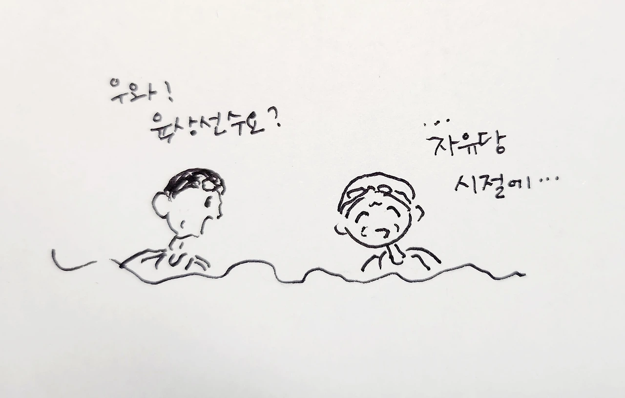 출발 지점 모퉁이는 매실 님의 지정 자리다. 매실 님은 왼쪽, 오른쪽으로 트위스트를 추듯이 몸을 돌리며 제자리뛰기를 한다. 어떤 날은 수영보다 제자리뛰기를 더 많이 하는 것 같다. 매실 님의 특기는 평영이다.