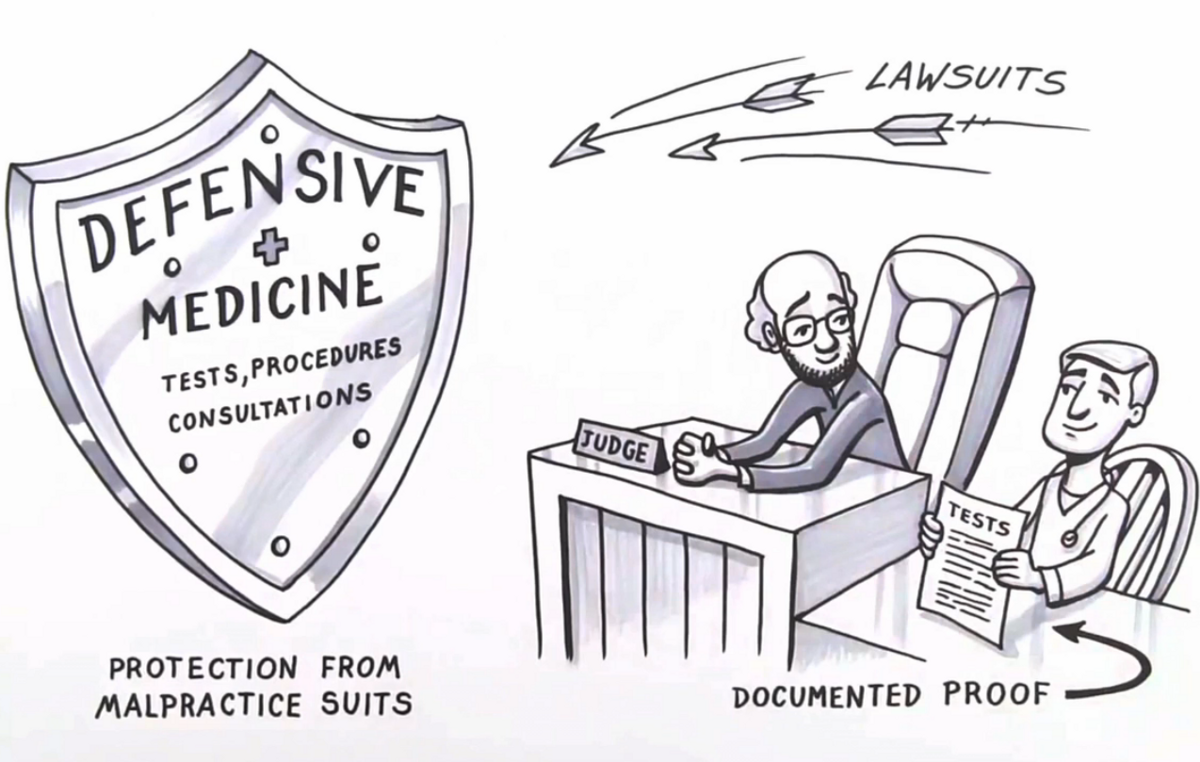 그런데 애초에 의료비가 치솟은 이유는 따로 있습니다. 혹자는 의료인들이 독점적인 지위를 남용하여 가격을 멋대로 올린 것이라 비판을 하지만 미국 의료비 폭등의 큰 원인 중 하나는 바로 의료소송 비용 때문입니다.