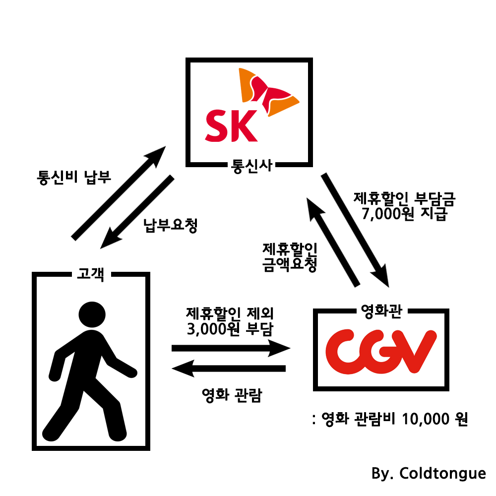 SKT 고객인 제가 CGV에서 영화를 본다고 가정해보겠습니다. 저는 평소에 SKT에서 요금 납부를 요청받고, 그에 따른 통신비를 납부하고 있습니다. 이때, SKT는 CGV와 제휴관계여서 SKT 고객이 CGV를 방문하면 제휴 할인을 받을 수가 있다고 가정하겠습니다. 영화 관람비용이 10,000원이고 만약 제휴 할인이 70%라면, 저는 영화관에 3,000원만 지불하고 CGV에서는 저에게 영화 관람이란 서비스를 제공합니다. 그러면 이제 CGV는 제휴 할인 차액만큼을 SKT에 청구하고, SKT에서는 확인을 거쳐 CGV에 차액인 7,000원을 지급하게 됩니다. 쉽죠?