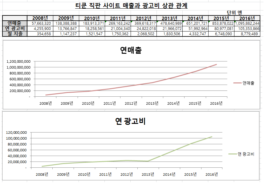 티쿤은 초창기에 월 35.4만 엔에서 시작해서 2012년에 월 200만 엔, 2014년에 월 433만 엔, 2016년에 월 877만 엔, 올해는 월 1천만 엔 이상으로 광고비를 계속 증액했습니다. 이건 직접 광고비이고 인건비까지 포함하면 훨씬 더 됩니다.