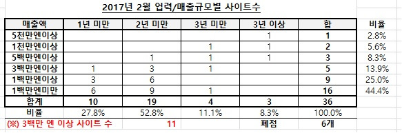 사이트 월 매출이 3백만 엔을 넘으면 이미 성공이라고 할 수 있습니다. 개점 2년 이상 사이트는 총 7개인데 6개가 3백만 엔을 넘었습니다. 2년 미만 사이트 중에도 5개 사이트가 이미 3백만 엔을 넘었습니다. 그야말로 대박입니다.