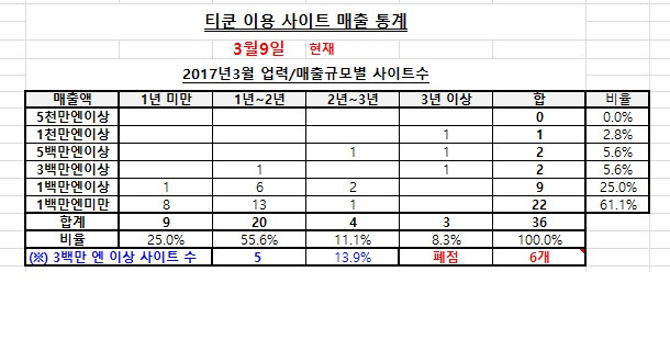 10일까지 추세로는, 1년 이상 사이트를 운영한 티쿤 이용 일본 직판 사이트 27개 중 14개(52%)가 3월에 3백만 엔 이상 매출을 기록할 것으로 보입니다.