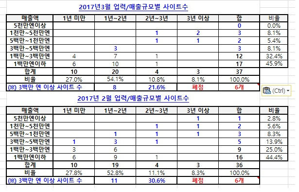 티쿤을 이용해서 1년 이상 일본 직판하는 사이트 27개 중 13개(48.1%)가 3월 매출 3천만 원을 넘을 것으로 예상됩니다. 그리고 현재 영업중인 사이트 총 37개 중 22개가 3월에 월매출 1천만 원을 넘을 것으로 보입니다.
