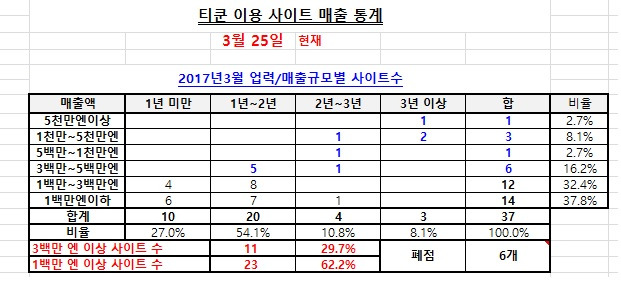 티쿤을 이용해서 1년 이상 일본에 직판 중인 사이트는 총 27개뿐입니다. 아직 서비스가 오래되지 않았습니다. 그런데 3월에 3천만 원 이상 매출을 올리는 사이트가 14개가 됩니다. 이 중 8개 사이트는 영업한 지 2년도 안 되었습니다. 속된 말로 그야말로 대박입니다. 3천만 원 매출이면 흑자가 나거나 혹은 조금만 더하면 흑자로 돌입하는 선입니다.