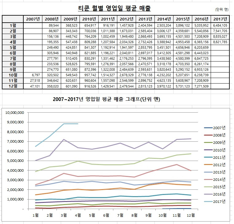 4월 상반기까지 티쿤 영업일 평균 매출은 880만 엔을 넘었는데 사실 3월보다 높습니다. 3월에는 10일에 2천1백만 엔짜리 특별 매출이 있었습니다. 4월 상반기에는 특별 매출이 없었는데도 3월 영업일 매출과 비슷합니다.