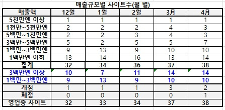 4월도 3월에 이어 24개 사이트가 매출 1백만 엔을 넘었습니다. 해외직판은 경쟁력은 있는데 경쟁자가 없으므로 일단 1백만 엔을 넘으면 된다고 할 수 있습니다. 그런 점에서 14개 사이트가 3백만 엔을 넘었고, 10개 사이트가 1백만 엔을 넘었으면 대단하다고 할 수 있습니다.