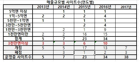 작년에 운영 중인 사이트 38개 중, 매출 3억 원을 넘은 사이트가 10개, 1억 원을 넘은 사이트가 9개였습니다.