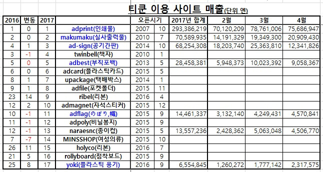 그간 티쿤을 이용해서 일본에 직판한 사이트들 중 성공한 사이트는 대개 인쇄물이나 판촉물이라는 현상이 나타나면서 인쇄, 판촉물 계열만 되는 게 아니냐는 의견이 있었습니다. 그런데 최근 급상승한 사이트 셋은 리본 사이트 둘과 플라스틱 용기 사이트 하나로 인쇄, 판촉물과 전혀 무관합니다.