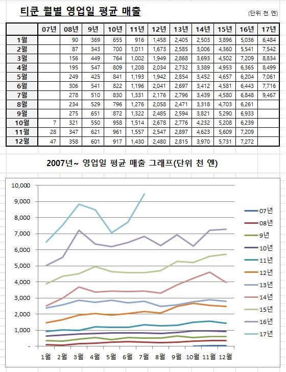 아래는 7월 5일까지 티쿤의 영업일 평균 매출 그래프매출 중 티쿤이 직영하는 사이트의 비중은 74.6%.