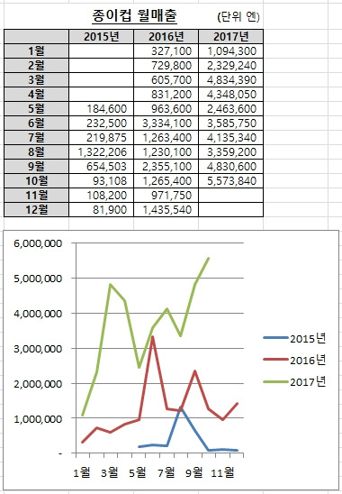 사이트 오픈하고 22개 월째인 2017년 3월부터 월매출 3천만 원을 넘겼고, 10월에는 5천만 원을 넘겼습니다.