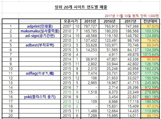 10배, 9배 성장한 사이트도 있으나 작년 상, 하반기에 오픈했으니 제외.