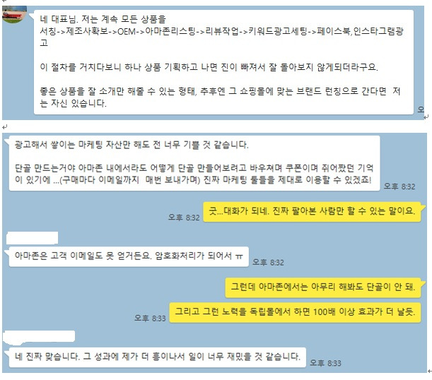 김OO님은 31세인데 중국에서 가방을 OEM으로 제조해서 아마존에 팔아 월 5백만 원 이상 수익을 얻습니다. 정말 대단한 일입니다. 아마존에서 이 정도 파는 사람 찾는 것도 쉽지 않습니다. 이 분이 지난 주 티쿤 사무실에 와서 저와 미팅하고 간 뒤 카카오톡으로 후기 남긴 내용입니다.