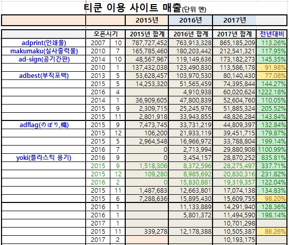 작년(2017년)에 한국 31개사, 38개 사이트가 일본 종합몰 티쿤재팬에서 판매한 금액은 총 21억 엔(전년 대비 24% 성장)에 이르렀습니다.