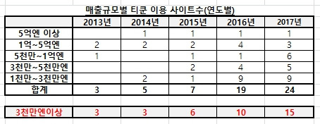 작년에 티쿤을 이용해서 일본에 직판한 사이트 중 연매출이 3천만 엔을 넘은 사이트는 총 15개로, 작년 10개에 비해 5개가 늘었습니다. 1천만 엔 이상은 19개에서 24개가 되었습니다. 티쿤식 해외직판의 위력입니다.