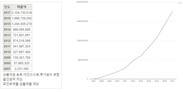 티쿤 전체 매출도 지난 10년 간 급증했습니다. 경쟁력은 있고 경쟁사는 없는 해외직판의 특징입니다.