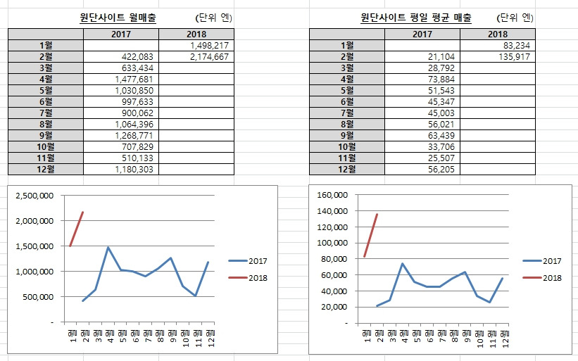 티쿤을 이용해서 자사(自社)몰로 일본에 진출한 r----.jp가 성공 조짐을 보이고 있습니다. r----.jp는 티쿤을 활용하여, 직물 원단에 원하는 디자인을 염색하여 파는 일본향 사이트를 운영하고 있습니다. 작년 2월에 런칭했는데 작년에는 평일 평균 4만5500 엔 매출에 머물렀습니다. 그런데 올해 1월에 평일평균 8만3200엔, 2월에 12만5900엔으로 평일평균 매출이 급증했습니다. 이 정도면 티쿤 경험에 미루어 대박 사이트가 됩니다.