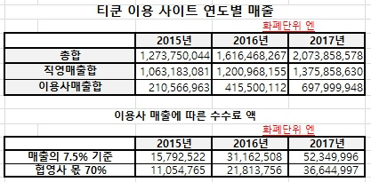 현재 티쿤을 이용해서 해외직판하는 사이트는 39개입니다. 이중 8개는 티쿤이 직영합니다. 타사 사이트는 31개입니다. 위 첫 표에서 볼 수 있듯이 작년에 타사 사이트가 올린 매출은 6억 9800만 엔(한화 69억 8천만 원)이었습니다. 수수료는 평균해서 매출의 7.5%로 5,235만 엔(한화 5억 2350만 원)입니다. 작년에 티쿤의 이용사 지원팀은 5명이었습니다. 5명 경상비는 연 2천5백만 엔(2억 5천만 원)이 안 됩니다. 수익률이 매우 좋습니다.