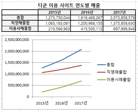 표에서 볼 수 있듯이 티쿤 직영 사이트도 매출이 잘 오르지만 티쿤 플랫폼 이용사 매출은 더 잘 오르고 있습니다.