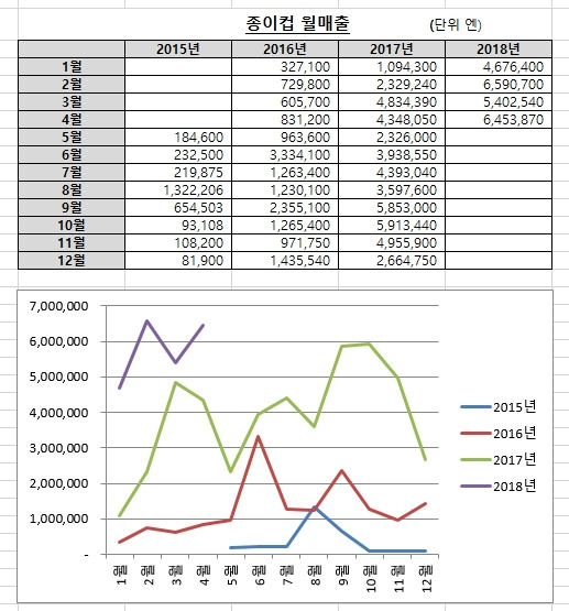 한국 종이컵을 일본에 전상 직판하는 (주)나래이엔씨(대표 박석준. 59)의 애드컵 성장이 눈부십니다. 애드컵은 올해 4월까지, 이미 작년 매출의 70%에 이르는 2,316만 엔 매출을 올렸습니다. 최근에는 월평균 6천만 원 가까운 매출을 올리고 있고, 매출 신장률도 대단합니다. 사이트 오픈하고 3년 딱 된 걸 감안하면 아주 훌륭합니다. 성수기로 접어들면서 7월 혹은 9월에는 월매출 1천만 엔을 내다본다고 합니다.