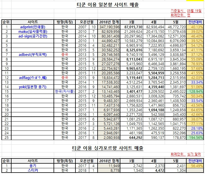 일본 5월은 골든위크가 있습니다. 그런데도 상위권 사이트들은 꾸준히 성장했습니다. 새로 하는 사이트 증가가 더딘 게 무척 아쉽습니다. 싱가포르향 용기 사이트는 고전을 면치 못하고 있고, 스티커 사이트는 가능성이 보이고 있습니다.