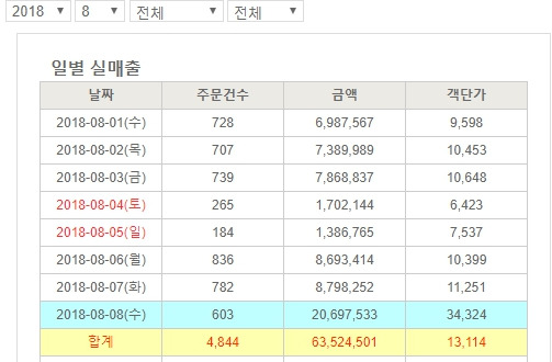 사람들은 명함 팔아서 어떻게 매출을 150억 원 넘기냐고 묻는데 보다시피 객단가가 보통 10만 원을 넘습니다. 고객이 일본 기획사이기 때문입니다. 폭염으로 조금 떨어지긴 했지만 보통은 하루에 800명~950명이 구매합니다.