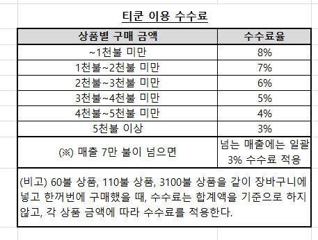 티쿤은 일본 전상점 판매 매출에 따라 아래와 같이 수수료를 받습니다.