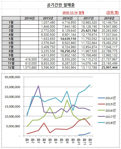 공기간판 사이트는 2014년 론칭한 이래 1년이 지나지 않아 월매출 3백 만엔을 돌파했고, 2년 조금 지나서 1천만 엔을 돌파했습니다. 매출이 오르락 내리락 하지만 전체로 보면 아주 순조롭게 성장하고 있습니다.